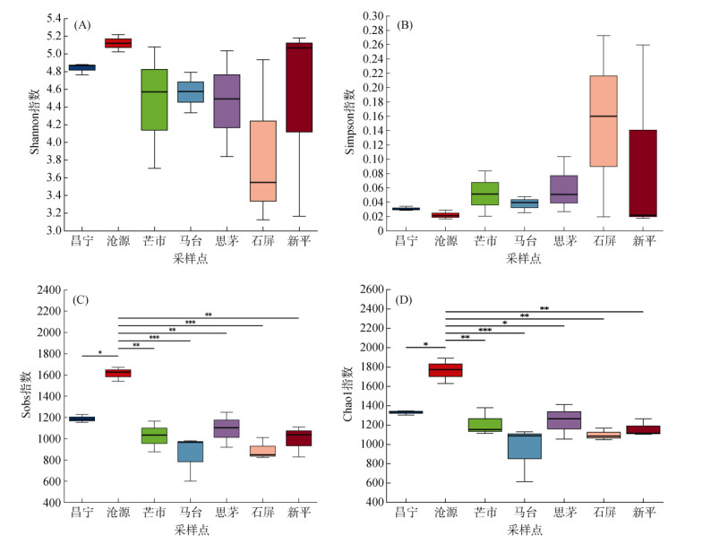 (图中*、**、***分别表示在不同地理种源地间差异在P < 0.05、P < 0.01、P < 0.001水平显著;下同) 图 1 土壤真菌群落α多样性指数 Fig. 1 Alpha diversity index of soil fungal community |
