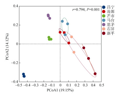 对真菌群落进行PCoA分析(图 2),并对组间群落结构差异进行ANOSIM显著性检验,排序结果显示,昌宁、芒市和思茅3个地区的土壤真菌群落较聚集,沧源、马台、石屏、新平4个地区的土壤真菌群落较分离,且昌宁离其他6个地区距离较远,说明昌宁的土壤真菌群落与其他6个地区存在较大的差异,而沧源和马台、石屏和新平之间有群落聚集的现象,说明沧源和马台、石屏和新平的真菌群落结构具有相似性。总体来说,7个地区的甜龙竹土壤真菌群落结构有显著差异(r=0.794,P=0.001)。