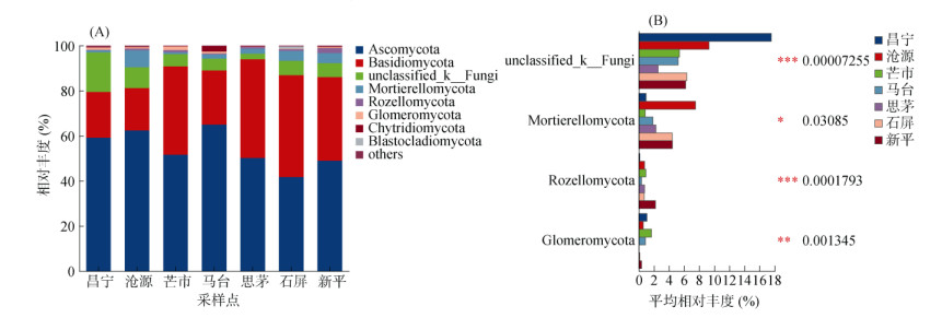 对获得的OTU序列进行分类注释,7个地区的土壤真菌隶属于16门63纲156目375科901属。土壤真菌群落在门水平上的物种组成如图 3A所示,不同地理种源甜龙竹土壤真菌在门水平上的主要优势菌群有子囊菌门(Ascomycota,41.72% ~ 62.44%)、担子菌门(Basidiomycota,18.72% ~ 45.23%)、未分类真菌(unclassified_k_Fungi,2.55% ~ 17.55%)和被孢霉门(Mortierellomycota,0.86% ~ 7.54%),这4类优势菌门占比高达90%以上。7个地区中除了石屏以担子菌门为第一优势菌门,其他6个地区均以子囊菌门为第一优势菌门,担子菌门为第二优势菌门。未分类真菌、被孢霉门、接合菌门(Rozellomycota)和球囊菌门(Glomeromycota)的平均相对丰度在7个地区呈显著差异(P < 0.05),昌宁的未分类真菌、沧源的被孢霉门、新平的接合菌门、芒市的球囊菌门的平均相对丰度高于其他地区(图 3B)。