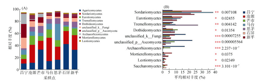 在纲水平上,不同地理种源甜龙竹土壤真菌以伞菌纲(Agaricomycetes,9.85% ~ 42.14%)、粪壳菌纲(Sordariomycetes,7.50% ~ 38.66%)、散囊菌纲(Eurotiomycetes,7.07% ~ 14.93%)、银耳纲(Tremellomycetes,2.55% ~ 17.55%)为优势菌纲(图 4A)。且在丰度前10位的菌纲中,除了伞菌纲,其他9个菌纲在不同地理种源地的土壤间均存在显著差异(P < 0.05),其中马台的粪壳菌纲、思茅的银耳纲、昌宁的unclassified_k_Fungi、unclassified_P_ Ascomycota和古根菌纲(Archaeorhizomycetes)、新平的Mortierellomycetes高于其他6个地区(图 4B)。