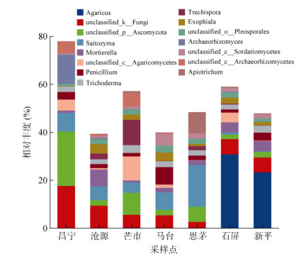 在纲水平上,各地区的真菌构成比例差异显著,本研究发现,沧源、芒市、马台、思茅、石屏和新平6个地区的粪壳菌纲(Sordariomycetes)和伞菌纲(Agaricomycetes)的丰度占比均高于其他菌群,只有昌宁地区是古根菌纲(Archaeorhizomycetes)、unclassified_k_Fungi和unclassified_p_Ascomycota的相对丰度较高。古根菌在系统发育上是位于子囊菌门类下的真菌,由数百种隐秘繁殖的丝状物种组成,这些物种不形成可识别的菌根结构并具有腐生潜力,但在根和根际土壤中无处不在,并显示出生态系统和宿主根系栖息地的特异性[35]。值得关注的是,昌宁地区还有两种未鉴定的菌群占比较高,这也说明了在真菌群落的组成上昌宁地区有其特殊性,其还需进一步研究。