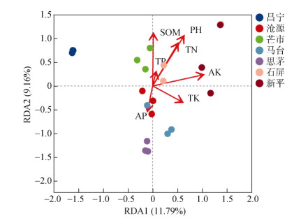 1.3 土壤因子测定土壤因子的测定均参照中华人民共和国农业行业标准执行。其中,pH测定参照NY/T 1377—2007[18];有机质(SOM)测定参照NY/T 1121.6—2006[19];有效磷(AP)测定参照NY/T 1121.7—2014[20];速效钾(AK)测定参照NY/T 889—2004[21];全氮(TN)测定参照NY/T 1121.24—2012)[22];全磷(TP)测定参照NY/T 88—1988[23];全钾(TK)测定参照NY/T 87—1988[24]。