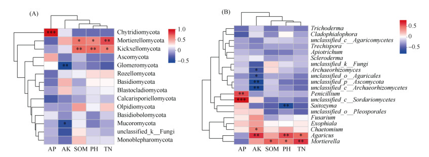(图中*、**、***分别表示相关性在P < 0.05、P < 0.01、P < 0.001水平显著) 图 7 土壤因子与真菌门(A)、真菌属(B)相关性热图 Fig. 7 Correlation heatmaps between soil factors with fungal phylum (A) and fungal genus (B) |