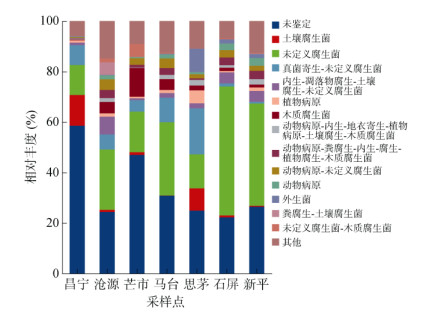 本研究中,虽然7个地区的优势菌群基本相同,但各地区优势菌群的组成结构差异明显,其中思茅的子囊菌和担子菌两类菌门总的相对丰度,石屏的芽枝霉门(Blastocladiomycota)、昌宁的unclassified_k_Fungi、沧源的Mortierellomycota、新平的接合菌门(Rozellomycota)、马台的壶菌门(Chytridiomycota)和芒市的球囊菌门(Glomeromycota)的相对丰度高于其他地区,说明各地区除了广泛存在的子囊菌门和担子菌门,都有各自占比较高的菌群。子囊菌被认为是土壤有机质分解的关键参与者[30],并且通过参与根系渗出、同化和有机质降解,在很大程度上主导了活跃的真菌群落[31]。此外,子囊菌门、芽枝霉门、Mortierellomycota、Olpidiomycota和壶菌门可以在植物和动物的残肢上腐生并分解其残骸[32]。球囊菌门能与植物形成丛枝菌根,并能直接吸收养分[33]。接合菌门和Zoopagomycotan从入侵植物中获取营养[34]。这些表明生态位中的真菌执行着各种任务。