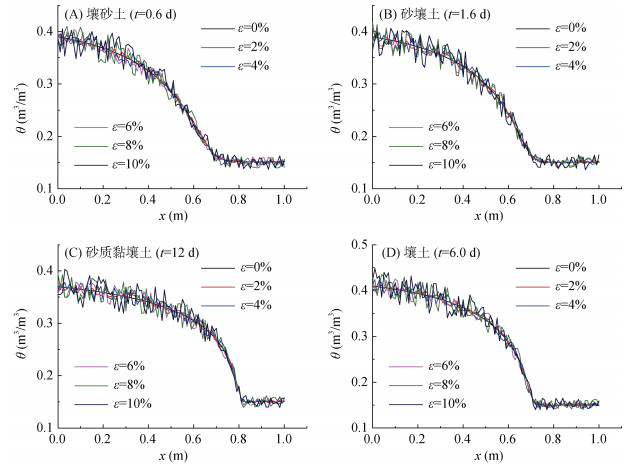 4种土体分别在t=0.6、1.6、12和6.0 d时,体积含水率随坐标变化的Hydrus-1D模拟结果如图 1所示。模拟结果通过式(19)引入随机误差,随机误差分别为0%、2%、4%、6%、8% 和10% 的结果也绘制于图 1。