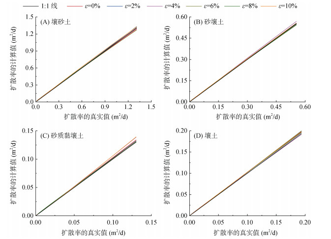 采用上述建立的迭代法分析图 1所示的数据,得到[θr, m, Ds]结果如表 2所示,将参数[θr, m, Ds]代入式(17)中,即可得到土壤水分扩散率的计算值,以理论值为横坐标,以计算值为纵坐标,展示土壤水分扩散率计算值与理论值的差异,结果如图 2所示。由图 2可知,不同测试误差的计算结果均分布在1︰1线附近,采用决定系数(式(20))量化计算值与理论值的误差,决定系数的结果也列于表 2。计算结果表明,当测试误差在[0, 10%]范围内时,决定系数均大于0.990 0,由此可见,迭代法的计算结果受体积含水率测试误差的影响较小。