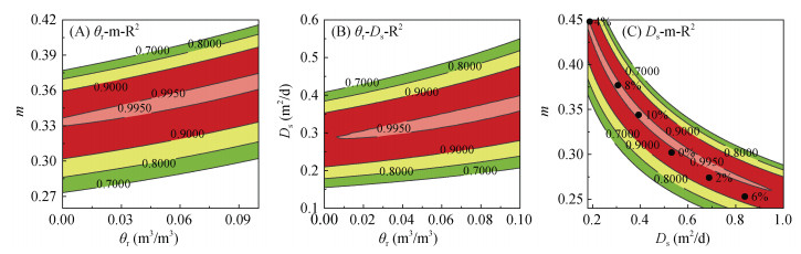 Hydrus-1D中,壤土VG模型参数[θr, m, Ds]的理论值为[0.078, 0.359, 0.352][27],将[θr, m, Ds]的理论值代入式(17)中,即可得到土壤水分扩散率的理论值Dtheory。同时改变两个参数的值,另一个参数取理论值,通过式(17)得到这种参数组合下土壤水分扩散率D,采用决定系数量化D与Dtheory的差异,则可以得到θr–m–R2、θr–Ds–R2和Ds–m–R2的响应曲面,结果如图 3所示。由图 3A和图 3B可知,响应曲面的等值线几乎相互平行,表明决定系数的变化对于θr不敏感,因而θr计算结果的变异系数较大,但是m和Ds取合适值时,不同的θr均能达到较大的决定系数。由图 3C可知,当给定θr时,决定系数为0.995 0对应的[m, Ds]参数组合呈月牙状,即在该范围的[m, Ds]参数值均能得到较为准确的土壤水分扩散率,说明参数[m, Ds]取值在有较大差异时,仍可得到与真实值相比差异较小的土壤水分扩散率。