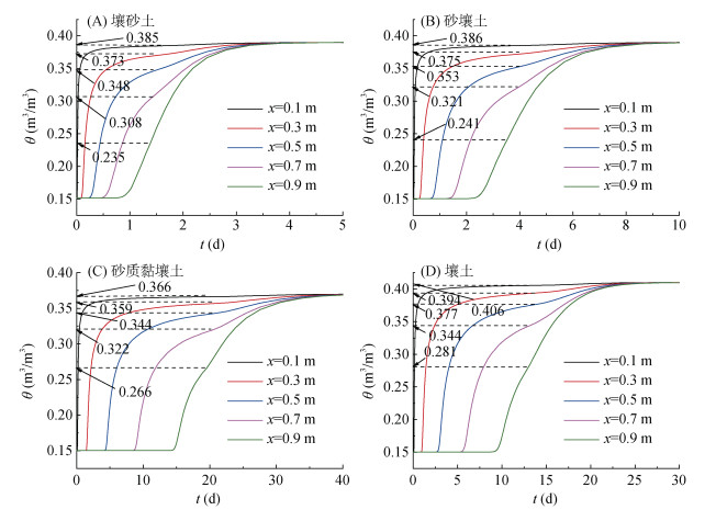 x=0.1、0.3、0.5、0.7和0.9 m处的体积含水率随时间的变化情况如图 4所示,采用文献[26]的方法确定受边界效应影响的临界含水率θlim,结果也列于图 4。随着监测点越靠近出水口,临界含水率越小,受边界效应影响的体积含水率范围越大。采用上述迭代法分析[θini, θlim]范围的θ – t数据,得到[θr, m, Ds]的计算值如表 3所示。仍然以壤土为例进行分析,θr、m和Ds的变异系数CV分别为96.7%、15.9%和40.2%,即当选择不同位置的θ – t数据分析时,θr和Ds具有较大的变异性。随着测点与入水口的距离增加,决定系数没有明显变化,决定系数均大于0.980 0。对于所分析的4种土体类型,当x=0.9 m时,不受边界效应影响的含水率区间分别为[0.150, 0.235]、[0.150, 0.241]、[0.150, 0.266]和[0.150, 0.281],得到的土壤水分扩散率的决定系数分别为0.998 5、0.998 7、0.997 9和0.998 4,均大于0.990 0。由此可见,受边界效应影响的临界含水率对计算结果的影响较小。
