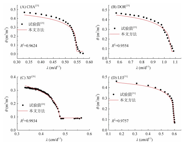 3 结论本文结合VG模型和Philip法,先预设模型参数,采用Philip法得到θ – λ数据的计算值,再以决定系数量化计算值与测试值的误差,通过内点法优化模型参数,以此建立具有抵抗测试误差能力的迭代法,并通过数值模拟和文献数据验证了该方法的合理性,得到以下结论: