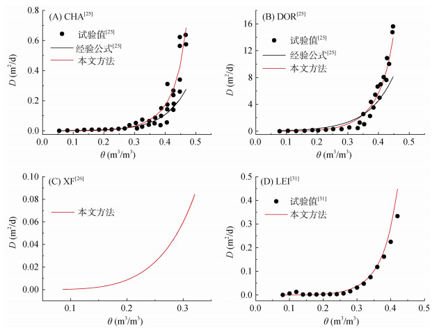 为了进一步通过试验数据验证本文提出方法的合理性,利用他人研究中的一维水平入渗试验数据进行验证(图 5,4种土柱分别为CHA[25]、DOR[25]、XF[26]和LEI[31])。采用迭代法分析时所需要的参数列于表 4,[θr, m, Ds]的计算结果也列于表 4。对于LEI[31],[θr, m, Ds]迭代法的计算结果为[0.034, 0.222, 8.131],将参数代入式(17),得到土壤水分扩散率如图 6所示,与水平吸渗法的结果进行对比,决定系数达到了0.891 5,将迭代法得到的土壤水分扩散率作为已知数据,采用Philip法计算λ随θ变化,结果如图 5D所示,与试验数据的决定系数为0.975 7。对于CHA[25]和DOR[25],土壤水分扩散率的计算结果分别如图 5A和图 5B所示,与试验数据进行比较,本文方法的决定系数分别为0.850 0和0.962 0,文献中经验模型的决定系数分别为0.500 3和0.713 3[25],本文方法优于经验模型,且对于体积含水率大于0.350 m3/m3对应土壤水分扩散率的结果,经验模型的决定系数分别仅为0.148 8和0.405 9,而本文方法分别为0.746 7和0.930 4,由此可见,本文方法可以弥补经验模型难以准确确定高体积含水率区间的土壤水分扩散率的不足。对于XF[26],测试数据为x = 0.45 m处的θ – t数据,临界含水率为0.321 m3/m3,[θr, m, Ds]迭代法的计算结果为[0.000, 0.218, 10.650],将参数代入式(17),得到土壤水分扩散率如图 6C所示,采用式(1)模拟一维水平入渗,得到x = 0.45 m处θ – t数据的计算值,并转化为θ–λ数据,结果如图 5C所示,其与试验值的决定系数为0.993 4。