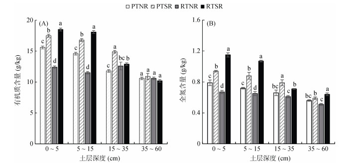 (图中小写字母不同表示同一土层不同处理间差异显著(P < 0.05),下图同) 图 1 不同处理下土壤有机质(A)和全氮(B)含量 Fig. 1 Soil organic matter (A) and total nitrogen (B) contents under different treatments |
