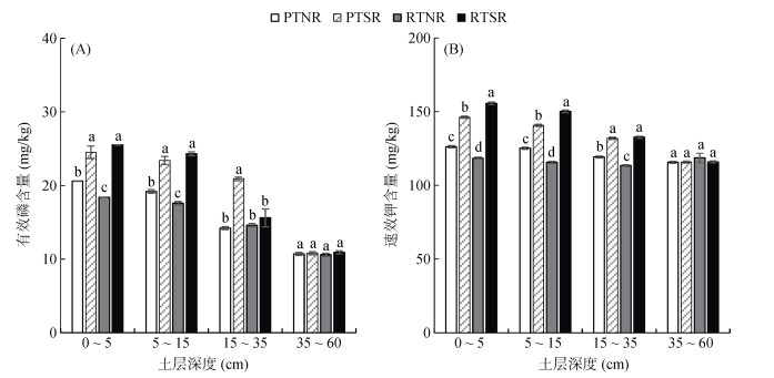 由图 2A和图 2B可知,耕作方式对0 ~ 5 cm和5 ~ 15 cm土层土壤有效磷含量以及0 ~ 35 cm土层土壤速效钾含量有显著影响,秸秆还田及耕作方式与秸秆还田互作对0 ~ 35 cm各土层土壤有效磷含量和速效钾含量均具有显著影响,但耕作方式和秸秆还田及二者互作对35 ~ 60 cm土层土壤有效磷和速效钾含量均无显著影响。与翻耕相比,秸秆不还田下旋耕显著降低0 ~ 15 cm土层土壤有效磷和速效钾含量以及15 ~ 35 cm土层速效钾含量;而在秸秆还田下旋耕显著降低15 ~ 35 cm土层土壤有效磷含量,显著提高0 ~ 15 cm土层速效钾含量。与秸秆不还田相比,除旋耕下15 ~ 35 cm土层有效磷含量外,秸秆还田显著提高0 ~ 35 cm各土层的磷钾含量,但对35 ~ 60 cm磷钾含量无显著影响。从互作效应看,0 ~ 5、5 ~ 15 cm土层土壤有效磷和速效钾含量均表现为RTSR > PTSR > PTNR > RTNR,除0 ~ 15 cm土层RTSR与PTSR间有效磷含量差异不显著外,各处理间差异均达到显著水平;其中,RTSR较PTSR、PTNR、RTNR有效磷和速效钾含量,在0 ~ 5 cm土层分别提高3.2%、23.8%、38.6% 和6.4%、23.3%、31.4%,在5 ~ 15 cm土层分别显著提高3.8%、26.6%、38.1% 和6.8%、20.0%、29.9%。在15 ~ 35 cm土层,土壤有效磷含量表现为PTSR > RTSR > RTNR > PTNR,其中PTSR较RTSR、RTNR和PTNR分别显著提高34.0%、43.2% 和47.2%,其他处理间差异不显著;土壤速效钾含量表现为RTSR > PTSR > PTNR > RTNR,除PTSR与RTSR间差异不显著外均达到显著水平,RTSR较PTNR和RTNR分别显著提高11.2% 和16.9%。