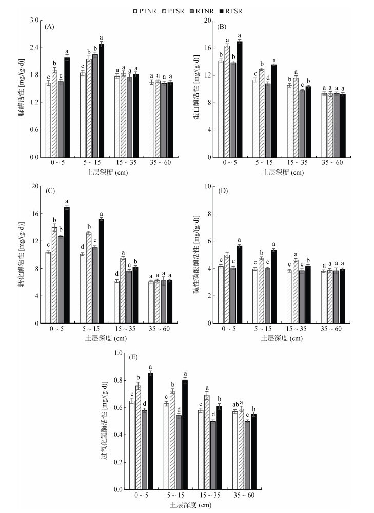 2.3.3 对土壤过氧化氢酶活性的影响如图 3E所示,除翻耕下秸秆还田在35 ~ 60 cm土层无显著效应外,耕作方式和秸秆还田及二者互作对0 ~ 60 cm各土层土壤过氧化氢酶活性均具有显著影响。旋耕与翻耕相比,秸秆不还田下土壤过氧化氢酶活性在0 ~ 5、5 ~ 15、15 ~ 35和35 ~ 60 cm土层分别显著降低10.8%、14.3%、13.8% 和12.3%;而秸秆还田处理下在0 ~ 15 cm土层显著增加,15 ~ 60 cm土层显著降低。秸秆还田与秸秆不还田相比,除翻耕下在35 ~ 60 cm土层增幅不显著外,无论翻耕还是旋耕,土壤过氧化氢酶活性均显著提高,且旋耕下的增幅明显高于翻耕。从互作效应看,RTSR在0 ~ 15 cm土层具有最高的土壤过氧化氢酶活性,其中,在0 ~ 5 cm土层较PTSR、PTNR和RTNR分别显著提高11.8%、30.8% 和46.6%,在5 ~ 15 cm土层分别显著提高11.1%、27.0% 和48.1%;PTSR在15 ~ 60 cm土层具有最高的土壤过氧化氢酶活性,其中,在15 ~ 35 cm土层较RTSR、PTNR和RTNR分别显著提高13.1%、19.0% 和38.0%,在35 ~ 60 cm土层较RTSR和RTNR分别显著提高7.3% 和18.0%。