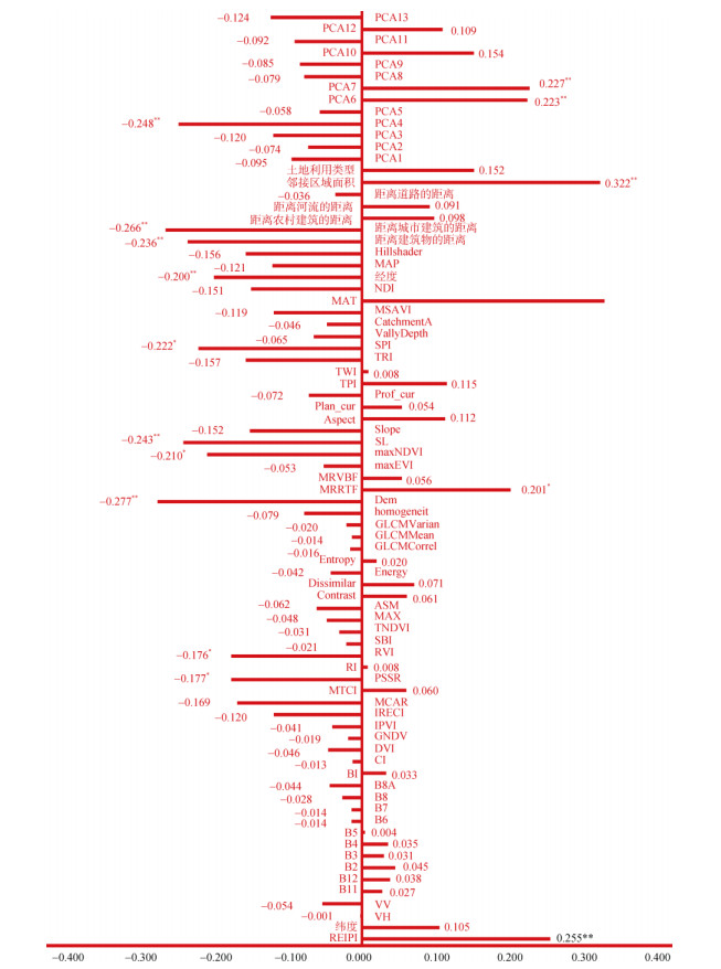 (REIPI,红边位置指数;VH、VV,后向散射系数;B2、B3、B4、B5、B6、B7、B8、B8A、B11、B12,Sentinel-2的B2、B3、B4、B5、B6、B7、B8、B8A、B11、B12单波段;BI,亮度指数;CI,颜色指数;DVI,差值植被指数;GNDV,绿光归一化差值植被指数;IPVI,红外植被百分比指数;IRECI,改进红边叶绿素指数;MCAR,修正的叶绿素吸收反射指数;MTCI,陆地叶绿素指数;PSSR,颜料特定的简单比率;RI,红光指数;RVI,比值植被指数;SBI,土壤背景指数;TNDVI转换归一化植被指数;MAX,最大概率指数;ASM,角二阶矩指数;Contrast,对比指数;Dissimilar,不相似性指数;Energy,能量指数;Entropy,熵指数;GLCMCorrel,灰度共生矩阵的相关性指数;GLCMMean,灰度共生矩阵的均值指数;GLCMVarian,灰度共生矩阵的方差指数;homogeneit,均匀性指数;Dem,数字高程模型;MRRTF,多尺度山顶平坦指数;MRVBF,多尺度山谷平坦指数;maxEVI,最大增强植被指数;maxNDVI,最大归一化植被指数;SL坡长;Slope,坡度;Aspect,坡向;Plan_cur,平面曲率;Prof_cur,剖面曲率;TPI,地形位置指数;TWI,地形湿度指数;TRI,地表粗糙指数;SPI,水流强度指数;Vally Depth,谷深;Catchment A,流域面积;MSAVI,土壤调节植被指数;MAT,年均温;NDI,归一化差异指数;MAP,年降水量;Hillshader,山体阴影;PCA1~PCA13,主成分1到主成分13。*、**分别表示相关性在P < 0.05、P < 0.01水平显著) 图 4 环境协变量与土壤容重的相关性分析 Fig. 4 Correlation analysis of environmental covariates with soil bulk density |