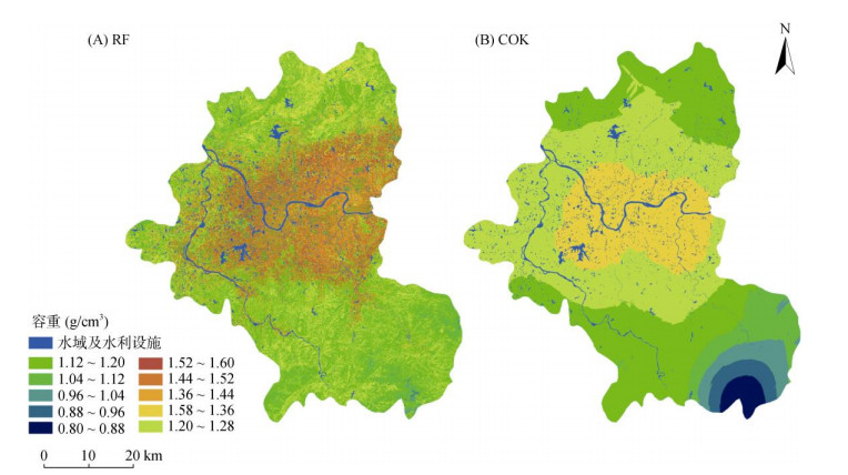 2.3 土壤容重空间预测分布特征将通过多重扩增与筛选方法获得的特征集S7变量(REIPI、REIPI与MAT的乘积、NDI与经度的乘积)分别输入RF模型和COK模型进行土壤容重的空间预测,结果表明,两种方法所展示的土壤容重空间变化趋势具有相似性,即由南北山地到中部盆地土壤容重逐渐升高(图 5),与样点数据空间分布特征一致,原因在于中部地区集中有住宅用地和工矿仓储用地,土壤容重高值点相对集中。此外,邻接域面积代表人为扰动范围和强度,与土壤容重的相关系数为0.322**,有显著正相关性(图 4),也间接验证了研究区中部余江、月湖和贵溪市区一带土壤容重较高的现象。