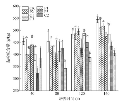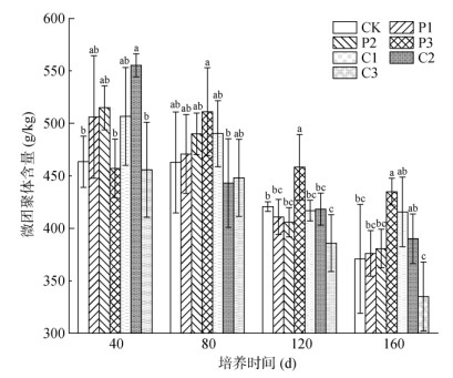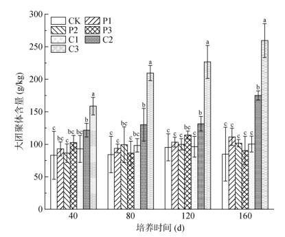 图 2为高分子材料配施木醋液条件下的土壤微团聚体含量。从培养80 d开始,P3处理的土壤微团聚体含量均在各处理中最大,培养80、120、160 d时其微团聚体含量分别为510.10、458.23和434.90 g/kg,分别较CK提高10.44%、8.91% 和17.26%,在培养120 d和160 d时与CK差异显著(P < 0.05)。在40 d时,C2处理的微团聚体含量最大,较CK显著(P < 0.05)提高19.81%。各培养时期C3处理的微团聚体含量均低于CK,分别为455.87、448.17、385.93和335.00 g/kg,较CK分别降低1.64%、3.15%、8.27% 和9.68%,其中在培养120 d时与CK差异显著(P < 0.05)。由此可知,0.4% 的γ-聚谷氨酸配施木醋液对土壤微团聚体含量总体有显著提升作用。