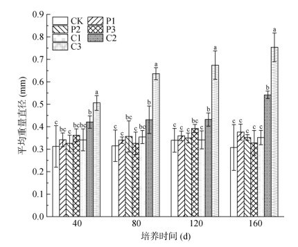 图 4为高分子材料配施木醋液条件下的土壤团聚体平均重量直径(MWD)。各培养时期各处理均能提升土壤MWD。由图 4可知,各时期C3处理的MWD均为最大,分别为0.51、0.64、0.67和0.75 mm,较CK分别显著(P < 0.05)提高64.52%、100.00%、97.06% 和141.94%。各时期C2处理的MWD均高于除C3外的其他处理,分别为0.42、0.43、0.43和0.54 mm,较CK分别显著(P < 0.05)提高35.48%、34.38%、26.47% 和74.19%。各时期其他处理的土壤MWD较CK也有一定程度的提高,在40、80、120和160 d时较CK分别提高6.45% ~ 16.13%、3.12% ~ 12.50%、0.58% ~ 14.71% 和6.45% ~ 22.58%。可见,壳寡糖配施木醋液对土壤团聚体稳定性有显著提升效应,且随壳寡糖用量的增加而增强。