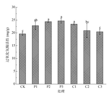 图 5为高分子材料配施木醋液条件下的土壤过氧化氢酶活性。各处理均能提升土壤过氧化氢酶活性,7种处理的土壤过氧化氢酶活性由大到小的顺序为:P3 > P2 > C1 > P1 > C2 > C3 > CK。除处理C2和C3外,其他处理的土壤过氧化氢酶活性较CK显著(P < 0.05)提升16.28% ~ 25.80%。可见,随着γ-聚谷氨酸用量的增加,过氧化氢酶活逐渐增强;而随着壳寡糖用量的增加,过氧化氢酶活性逐渐减弱。