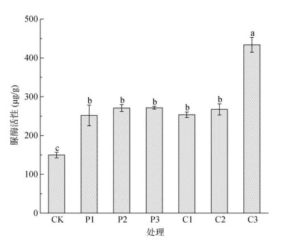 图 6为高分子材料配施木醋液条件下的土壤脲酶活性。各处理均能显著提升土壤脲酶活性。7种处理的土壤脲酶活性由大到小的顺序为:C3 > P3 > P2 > C2 > C1 > P1 > CK。C3处理的脲酶活性为433.738 μg/g,显著(P < 0.05)高于其他各处理,较CK提升189.76%。其余6组处理的土壤脲酶活性较CK显著(P < 0.05)提升68.24% ~ 81.41%。随着壳寡糖用量的增加,土壤脲酶活性逐渐增强。