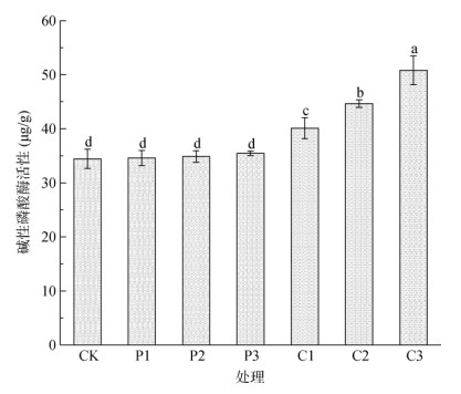 图 7为高分子材料配施木醋液条件下的土壤碱性磷酸酶活性。7种处理的土壤碱性磷酸酶活性由大到小的顺序为:C3 > C2 > C1 > P3 > P2 > P1 > CK。不同用量的壳寡糖与木醋液配施均能够显著(P < 0.05)提升碱性磷酸酶活性,且碱性磷酸酶活性随着壳寡糖用量的增大逐渐增强,分别为40.11、44.64和50.82 μg/g,较CK分别提升16.46%、29.62% 和47.56%。