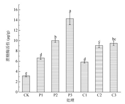 图 8为高分子材料配施木醋液条件下土壤蔗糖酶活性。各处理均能显著提升土壤蔗糖酶活性,7种处理的土壤蔗糖酶活性由大到小的顺序为:P3 > P2 > C3 > C2 > P1 > C1 > CK。随着与木醋液配施的γ-聚谷氨酸用量的增加,土壤蔗糖酶活性逐渐增强,较CK显著(P < 0.05)提高109.46%、216.09% 和350.16%;同样随壳寡糖用量增加,蔗糖酶活性增强,分别较CK显著(P < 0.05)提高84.86%、186.12% 和200.00%。