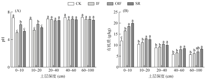 2 结果与分析 2.1 长期不同施肥土壤剖面pH和有机质含量差异甘薯–小麦体系经过13年连续施肥后,不同施肥处理下0 ~ 20 cm土壤pH存在明显差异(图 1A)。与CK处理相比,IF、OIF和SR处理的pH在0 ~ 20 cm的土壤中均显著降低,其中IF处理的pH在0 ~ 20 cm土壤下降最多,平均降低了1.8个单位。随着土壤深度的增加,各处理的pH逐渐趋于稳定,在20 ~ 100 cm土壤深度,IF、OIF和SR处理间的pH并无明显差异。