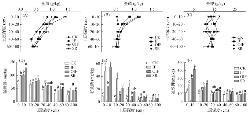 长期不同施肥处理下土壤全磷含量均随着土层深度的增加而逐渐降低(图 2B),不同施肥处理的全磷含量在40 cm以下土层无明显差异。与CK处理相比,IF、OIF和SR处理使0 ~ 10 cm土层的全磷含量增加了66.4%、115.3% 和108.1%,10 ~ 20 cm土层的全磷含量增加了19.2%、42.9% 和30.5%。IF、OIF和SR处理下0 ~ 20 cm土层全磷平均含量分别为0.77、0.96和0.91 g/kg,与IF处理相比,OIF和SR处理的全磷含量增加了约20%。IF处理的有效磷含量在0 ~ 40 cm土层中均显著增加,而OIF处理的有效磷含量仅在0 ~ 10 cm土层显著增加(图 2E)。在0 ~ 10 cm土层中,SR处理的有效磷含量最高,达到54.7 mg/kg,比CK处理增长了4倍。