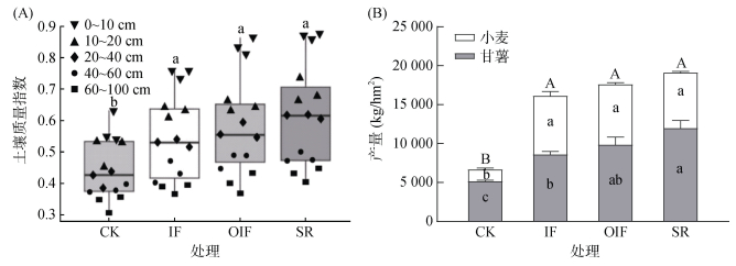 2.3 长期不同施肥土壤质量指数与作物产量差异长期不同施肥处理土壤质量指数在整个剖面上均显著高于CK处理,在不同剖面深度下SR处理的土壤质量指数均最高,且SR处理在0 ~ 40 cm土层的土壤质量指数均大于0.6,而IF和OIF处理的土壤质量指数仅在0 ~ 20 cm土层中大于0.6(图 3A)。与IF处理相比,SR处理土壤质量指数提高14.9%。与CK处理相比,长期施肥显著提升了小麦和甘薯产量,但小麦产量在3个施肥处理间无显著差异。SR处理的甘薯产量最高,分别比CK和IF处理显著增加了39.0% 和131.3%,达到11 960 kg/hm2 (图 3B)。