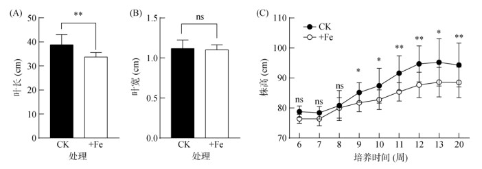 2 结果与分析 2.1 铁毒胁迫对水稻叶长、叶宽和株高的影响铁毒胁迫(+Fe)显著抑制水稻剑叶叶长,从对照(CK)条件的39 cm下降至34 cm,下降比例13%(图 1A)。而剑叶叶宽在对照和铁毒胁迫条件下均为1.1 cm,无明显差异(图 1B)。水稻生长8周内,铁毒胁迫(+Fe)尚未对株高产生显著抑制,从第9周开始对株高产生抑制作用,并随着处理时间延长而逐渐增大,最终使株高降低了6%(图 1C)。