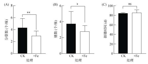 分析铁毒胁迫(+Fe)对分蘖数和穗数的影响,数据显示,铁毒胁迫降低分蘖数32%,由每株4.3个减少至2.9个(图 2A)。与对照相比,铁毒胁迫使穗数减少26%,由每株的3.7个减少至2.8个(图 2B)。但是,铁毒胁迫对抽穗时间未见显著影响(图 2C)。