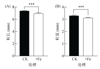 图 3 铁毒胁迫(+Fe)对水稻籽粒长宽的影响 Fig. 3 Effects of iron toxicity (+Fe) on grain length and width of rice |