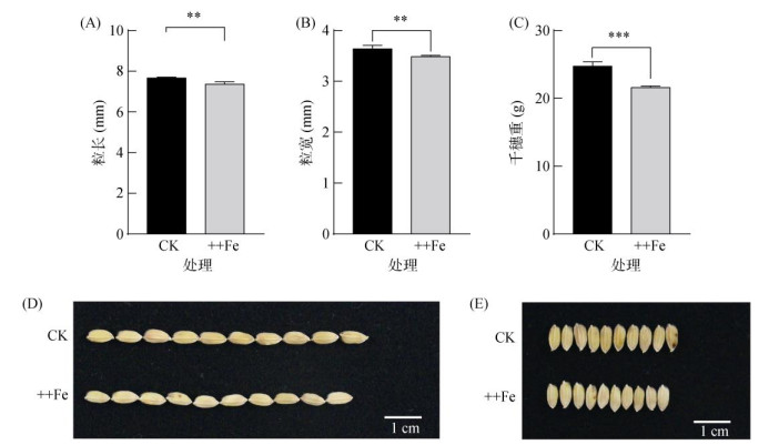 铁毒胁迫(+Fe和++Fe)显著影响水稻籽粒形态,平均粒长减少0.30 mm,粒宽减少0.15 mm,均下降5%(图 3、图 4A、图 4B、图 4D和图 4E)。+Fe和++Fe条件下籽粒长、宽减小幅度接近,进一步测定++Fe条件下的千粒重和铁含量指标,发现由于籽粒大小的变化,千粒重也受到明显影响(图 4C)。铁毒胁迫(++Fe)使水稻千粒重由25 g降至22 g,下降比例13% (图 4C)。