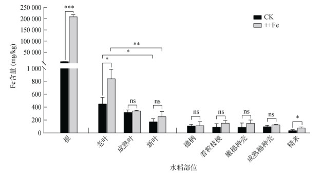 水稻根部是直接接触铁毒胁迫的部位,由图 5可知,根部铁含量在各部位中最高;在铁毒胁迫(++Fe)下,根部的铁含量为老叶铁含量的260倍,为对照条件下根部铁含量的27倍。地上部不同老化程度的叶片铁含量有明显差异。新叶和成熟叶的铁含量在铁毒胁迫和对照条件下没有显著差异,而老叶铁含量在铁毒胁迫条件下增幅近1倍,由对照的450 mg/kg增至840 mg/kg。在穗和籽粒构成的各部位,穗柄、着粒枝梗、嫩穗种壳、成熟穗种壳的铁含量在铁毒胁迫条件下与对照未见显著差异,而糙米铁含量在铁毒胁迫条件下显著增加近1倍,由对照的36 mg/kg增加至77 mg/kg。