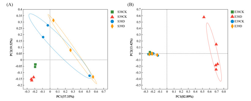 水稻根系内生细菌PCoA结果(图 2B)表明,第一和第二主坐标轴贡献率分别是82.89% 和13.42%,E38CK、E39CK和E39D均发生重叠,并与E38D显著分离。表明正常灌溉组E38CK、E39CK与干旱胁迫组E39D细菌群落组成相似,但与E38D细菌群落组成有显著差异。说明干旱胁迫导致水稻E000038根系内生细菌群落组成发生显著改变,而水稻E000039根系内生细菌群落组成未受干旱胁迫的影响。