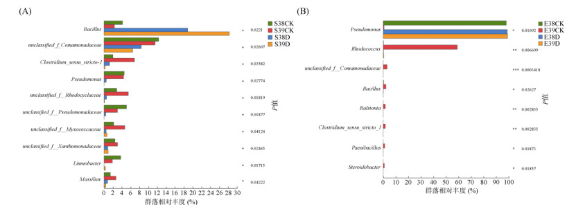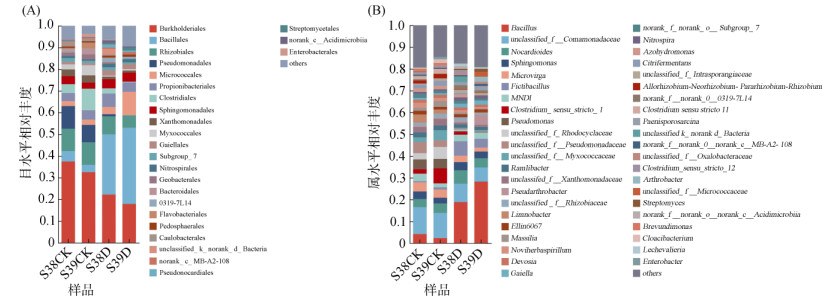 在目水平上,E000038和E000039根际土壤细菌相对丰度前10位分别为伯克氏菌目(Burkholderiales),占比17.89% ~ 37.45%;芽孢杆菌目(Bacillales),占比3.35% ~ 35.08%;根瘤菌目(Rhizobiales),占比5.75% ~ 10.40%;假单胞菌目(Pseudomonadales),占比1.01% ~ 10.43%;微球菌目(Micrococcales),占比2.28% ~ 10.83%;丙酸杆菌目(Propionibacteriales),占比3.74% ~ 6.19%;梭菌目(Clostridiales),占比0.31% ~ 9.93%;鞘脂单胞菌目(Sphingomonadales),占比2.83% ~ 4.22%;黄单胞菌目(Xanthomonadales),占比1.01% ~ 3.31%;黏球菌目(Myxococcales),占比0.46% ~ 4.68%(图 3A)。伯克氏菌目在样品S38CK和S39CK中均为优势类群,相对丰度分别为37.45% 和32.54%;在干旱胁迫下芽孢杆菌为S38D和S39D样品中的优势类群,相对丰度分别为27.72% 和35.08%,与正常灌溉组相比分别增长了483.57% 和950.23%。