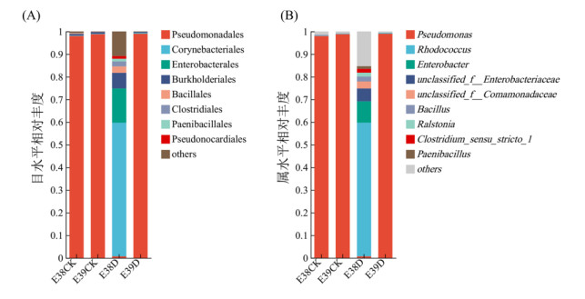 在目水平上,水稻根内生细菌相对丰度较高的细菌目主要为假单胞菌目(Pseudomonadales),占比0.70% ~ 99.00%;棒杆菌目(Corynebacteriales),占比0.12% ~ 59.00%;肠杆菌目(Enterobacterales),占比15.12%;伯克氏菌目(Burkholderiales),占比0.40% ~ 6.87%;芽孢杆菌目(Bacillales),占比0.1% ~ 2.89% (图 4A)。正常灌溉组E38CK和E39CK样品中的优势菌群均为假单胞菌目,相对丰度分别高达98.00% 和98.80% 干旱胁迫组E38D样品的主要优势菌群为棒杆菌目和肠杆菌目,相对丰度分别为59.00% 和15.12%,而假单胞菌目的相对丰度仅为0.70%;E39D样品的细菌群落结构未发生变化,优势菌群仍为假单胞菌目,相对丰度为99.00%。