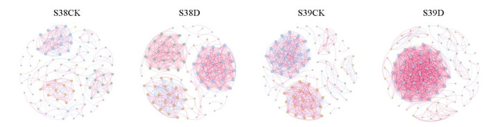 正常灌溉组与干旱胁迫组根际土壤细菌群落网络拓扑特征有明显差异。相比于样品S38CK和S39CK,样品S38D和S39D中细菌共生网络总节点数无明显变化,平均路径长度、负相关性和模块化系数占比均有不同程度的降低,边数、平均连通度和正相关性均有不同程度的升高。总边数越多,网络越复杂;平均路径长度越低,网络越紧密[16]。说明干旱胁迫使水稻根际土壤细菌网络变得更加紧密。
