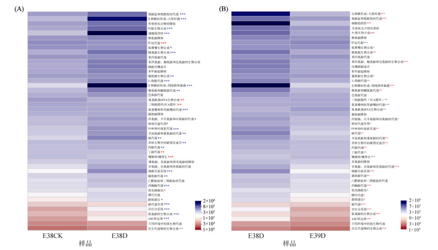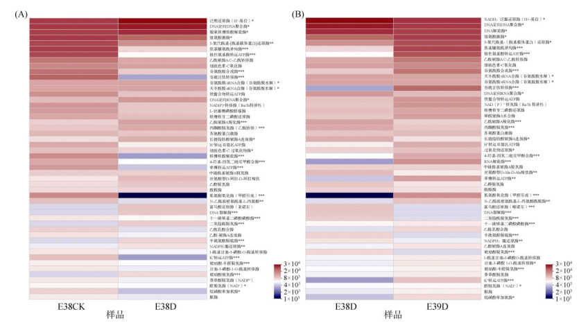 (A:E000038根系内生细菌;B:干旱胁迫组根系内生细菌。星号表示两个样本的细菌功能基因编码酶的相对丰度具有显著变化,* 为P < 0.05,**为P < 0.01,***为P < 0.001;图A中的蓝色星号表示样品E38D中相对于样品E38CK中显著降低,红色星号表示样品E38D中相对于样品E38CK中显著升高;图B中的蓝色星号表示样品E39D中相对于样品E38D中显著降低,红色星号表示样品E39D中相对于样品E38D中显著升高。下同) 图 7 根系内生细菌功能基因编码酶的相对丰度热图 Fig. 7 Heatmap of relative abundance of enzymes encoded by functional genes of endophytic bacteria in roots |