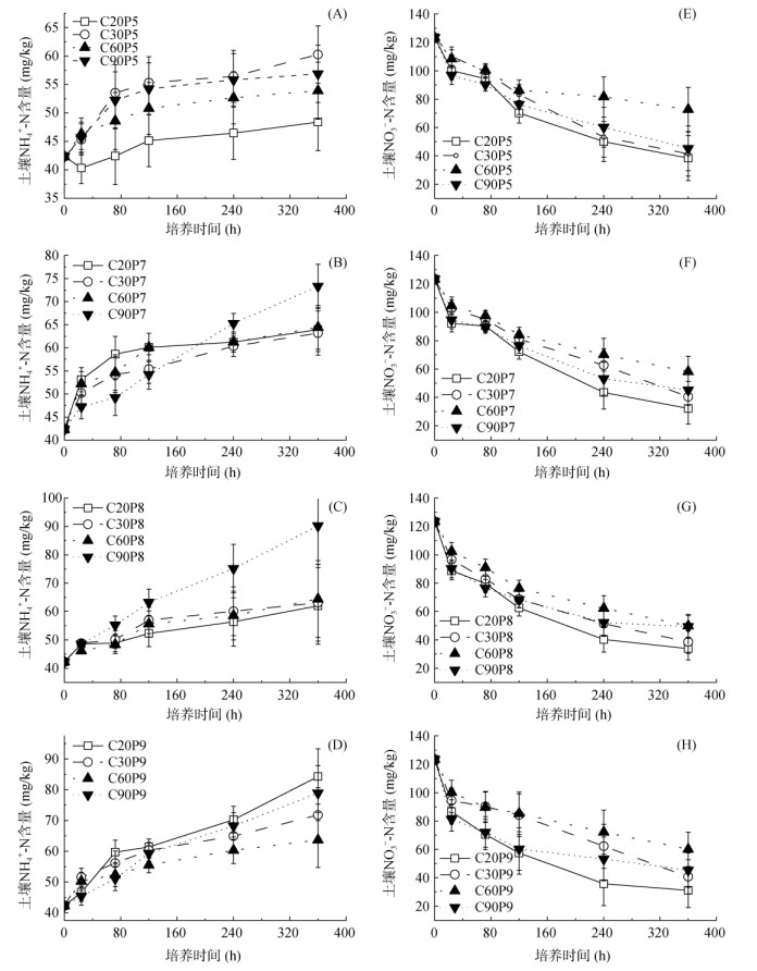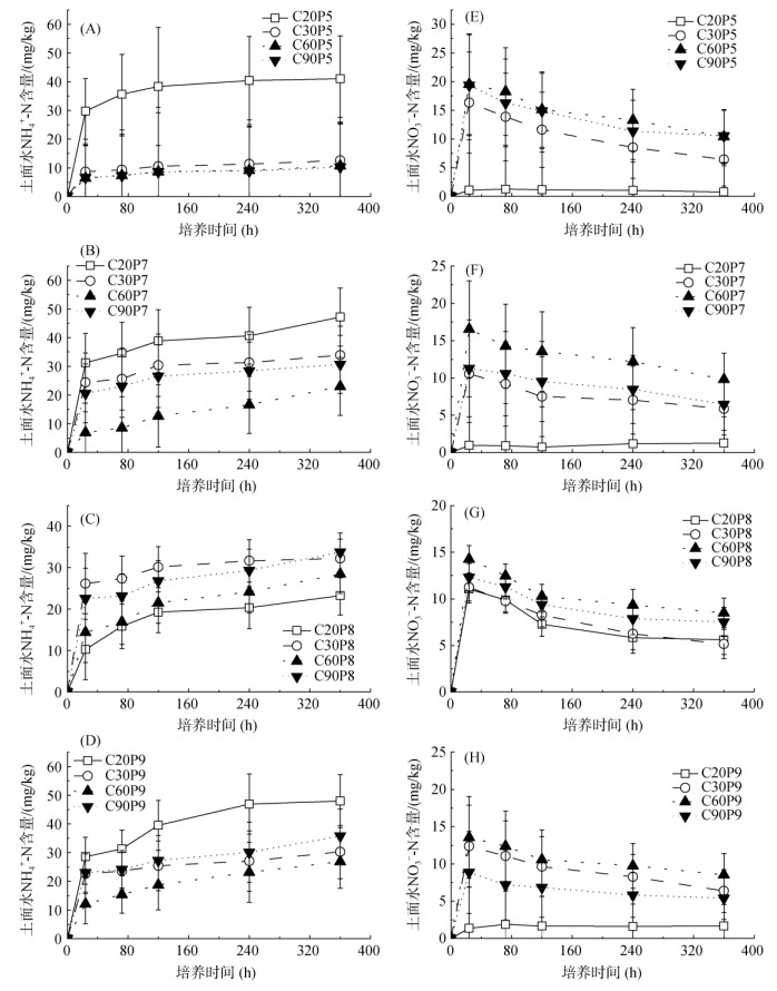 2.2 不同土壤pH和外源有机物料碳氮比调控组合下土壤NH4+-N、NO3–-N变化规律土壤NH4+-N和NO3–-N是作物生长发育的主要氮源。总体来看,无论何种pH和外源有机物料C/N,土壤NH4+-N含量均随着培养时间的推移而逐步增加,而土壤NO3–-N含量明显下降,但不同处理间的变化趋势有明显差异。其中,当不调控pH时(pH5),C/N 30、C/N 60、C/N 90有机物料处理土壤NH4+-N含量上升速率要显著高于C/N 20有机物料处理(图 1A)。当土壤pH增加至7或8时,C/N 90有机物料处理的土壤NH4+-N含量增加速率显著高于其他处理,但C/N 20、C/N 30、C/N 60有机物料处理间的NH4+-N含量变化速率无显著差异(图 1B ~ 1C)。然而,土壤pH调节至9时,土壤NH4+-N含量变化速率与外源有机物料C/N的关系并不紧密,C20P9处理土壤NH4+-N含量增加速率最高,为0.11 mg/(kg·h);C60P9处理土壤NH4+-N含量增加速率最小,为0.06 mg/(kg·h)。另外,C90P8处理土壤NH4+-N含量增加速率显著高于其他处理,为0.13 mg/(kg·h)。