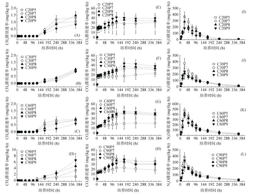 所有处理CO2排放速率均呈现明显的先增加后平稳再增加的趋势。pH 7、pH 8和pH 9水平下,各C/N有机物料处理的CO2排放速率均显著高于pH 5水平下各处理结果(图 3E ~ 3H)。其中,在pH 5 ~ 7时,C20P5、C30P7处理在培养结束时(360 h)的CO2排放速率分别为16.17、30.47 mg/(kg·h),明显低于其他高C/N比有机物料处理;在pH 8 ~ 9时,C90P8、C90P9处理的CO2排放速率最低,分别为31.18、29.73 mg/(kg·h),而C60P8、C60P9处理的CO2排放速率最高,分别为38.52、40.42 mg/(kg·h)。