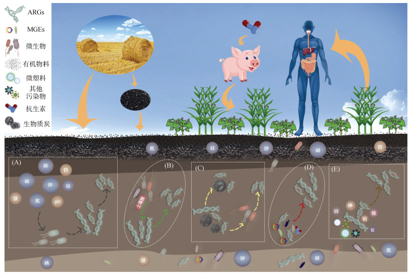 (A. 有机物料还田土壤抗生素抗性基因(Antibiotic resistance genes,ARGs)迁移扩散途经;B. 土壤理化性质对ARGs扩散的影响;C. 土壤微生物对ARGs的作用;D. 生物质炭对ARGs的作用;E. 重金属及其他污染物对ARGs的影响) 图 1 植物源有机物料添加影响ARGs的主要途径 Fig. 1 Main ways in which the addition of plant-derived organic materials affects ARGs |