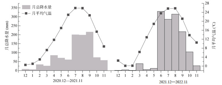 图 1 试验期间月平均气温及月总降水量 Fig. 1 Average monthly temperature and total monthly rainfall during the experiment period |