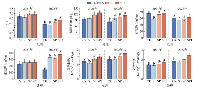 不同施肥处理对收获期土壤化学性质影响显著(图 2)。与2021年相比,2022年土壤pH下降0.74 ~ 0.84个单位。两年间,单独施硫酸钾肥的S处理pH最低,杂卤石配施硫酸钾的SP1处理在维持土壤pH方面表现最好,其次是SP处理。与S处理相比,SP1、SP处理pH分别平均提高7.41%、5.17%。综合两年来看,与S处理相比,SP、SP1处理有效提高土壤中碱解氮、有效磷、交换性钙、交换性镁的含量,碱解氮、有效磷含量在2021年差异显著,交换性钙、镁含量在2022年差异显著,其中,SP1处理最为突出,4项指标平均分别提高21.38%、21.31%、34.97%、32.10%。施钾提高了土壤中速效钾含量,随着施肥年限的增加,不同处理间土壤pH、速效钾差异性提高。2022年,各施钾处理土壤速效钾含量均显著高于CK处理;在施钾处理中,SP1处理显著高于S、SP处理。