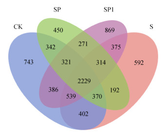 通过维恩图(图 3)分析可以发现,各处理苹果根区土壤样本共有OTU 2 229个,CK、S、SP和SP1处理中的特有OTU分别为743、592、450、869个。各处理样本微生物特有OTU表现出一定差异性,说明不同施肥方式对根区土壤细菌群落结构产生影响。