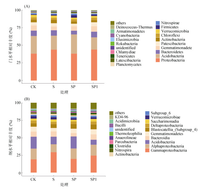 在纲水平上(图 4B),γ变形菌纲(Gammaproteobacteria,19.05% ~ 29.24%)相对丰度最高,其次是α变形菌纲(Alphaproteobacteria,11.28% ~ 15.51%)、酸杆菌纲(Acidobacteriia,7.13% ~ 17.17%)。与CK处理相比,S处理α变形菌纲、酸杆菌纲相对丰度分别降低26.14%、36.09%,γ变形菌纲相对丰度显著提高52.88%;SP1处理γ变形菌纲相对丰度提高27.75%,酸杆菌纲相对丰度显著降低57.99%。