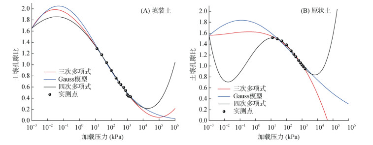 对10个土壤压实曲线参数模型的数值预试验表明,三次多项式、四次多项式、Gauss模型在拟合填装土和原状土实测荷载-孔隙比数据时,虽然拟合效果总体较好(四次多项式在10个模型中表现最好,其AIC、RMSE最小,R2最大),但在压实曲线的起始段(0 ~ 10 kPa)和结尾段(104 ~ 106 kPa)出现过度拟合现象,曲线形态偏离了实测值(图 1),没有实际物理意义,因此在后续结果分析中将这3个模型剔除,仅讨论其他7个模型的计算结果。