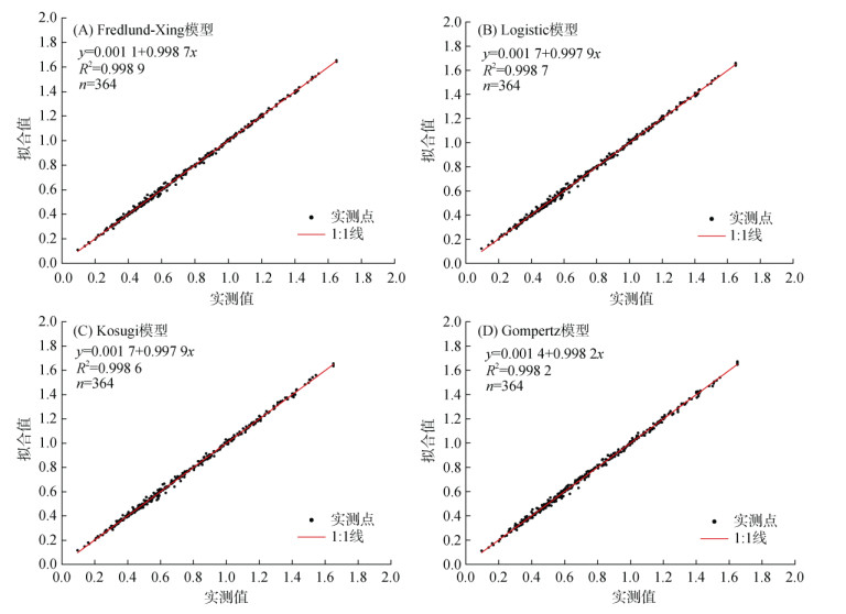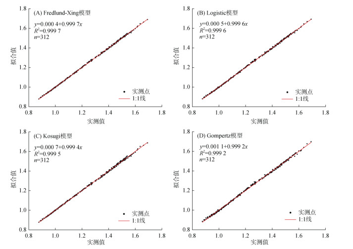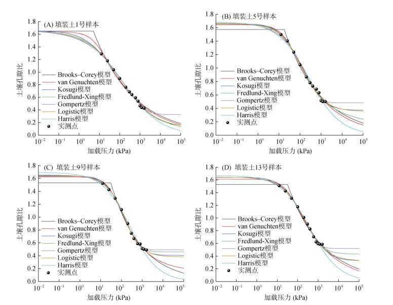 从填装土和原状土的拟合效果来看,7个模型总体均较好,即使是拟合效果相对较差的Harris模型,其在填装土和原状土上的R2也均大于0.99。但对比表 2和表 3发现,无论是AIC、R2或RMSE,同一模型在原状土上的拟合效果均略优于填装土。如Fredlund-Xing模型在原状土的AIC = –138.314 1、R2 = 0.999 7、RMSE=0.001 0,而在填装土的AIC = –113.055 7、R2 = 0.998 8、RMSE = 0.002 8;Logistic模型在原状土的AIC = –137.783 3、R2 = 0.999 6、RMSE = 0.001 1,而在填装土的AIC = –112.618 1、R2 = 0.998 6、RMSE = 0.003 1。分析其原因,可能是因为填装土是经过人工过筛、研磨和填装,土壤颗粒在田间的自然排列分布状态被扰动,试验中无法反映田间状态下的土壤结构和应力历史;其次,为达到试验目的,人为设置了样品不同的初始容重和含水率,进一步改变了土壤的孔隙结构和水分状态;此外,在室内单轴压缩试验中,随加载压力的增大,填装土的孔隙比变化区间(0.109 7 ~ 1.670 6)远大于经过轮胎碾压的原状土(0.877 9 ~ 1.699 1),填装土的实测压实曲线点间也更加离散(图 2、图 4),这在一定程度上也降低了模型最优化求解时的精度。