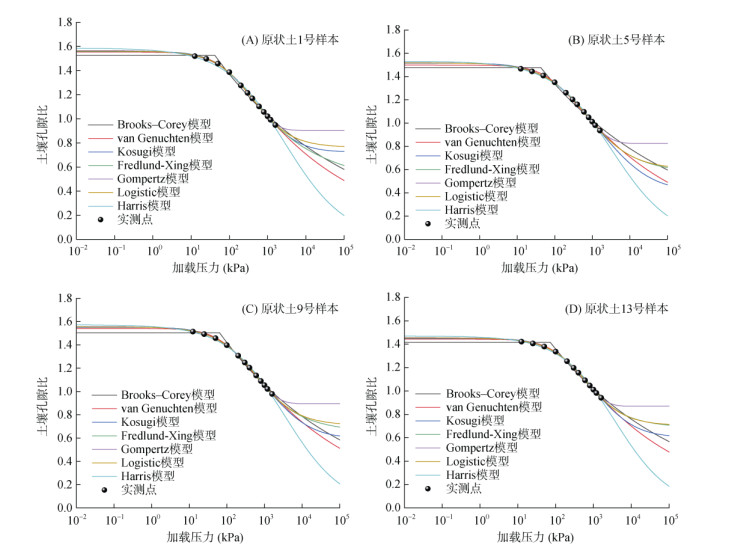 图 5 四个最优模型拟合与实测土壤孔隙比的对比(原状土) Fig. 5 Comparison of void ratios measured and fitted by four optimal models (undisturbed soils) |