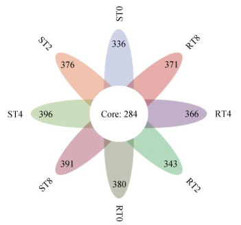 2 结果与分析 2.1 连作条件下烟草根腐病抗(感)品种根际土壤真菌群落OTU分析基于97% 的相似性条件下,32个样品共得到5 231个OTU(图 1)。RT0处理特有OTU数较ST0处理增加13.1%;RT2较ST2处理,RT4较ST4处理,RT8处理较ST8处理特有OTU分别降低了9.6%、8.2% 和5.4%,说明相同连作年限下感病品种根际土壤真菌特有OTU数较抗病品种多。