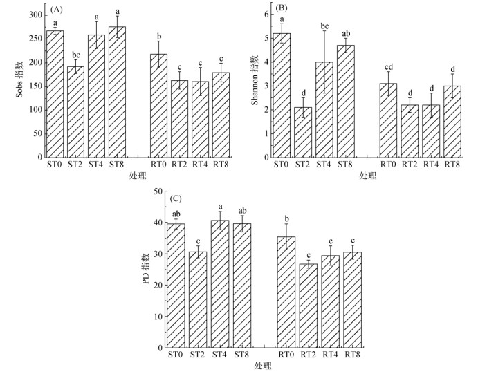 图 2A和图 2B显示,ST0、ST4和ST8处理真菌群落Sobs指数和Shannon指数均显著高于ST2、RT0、RT2、RT4、RT8处理(P<0.05),其中ST2 ~ ST8处理Sobs指数和Shannon指数呈增加趋势,RT2 ~ RT8处理变幅较小,长期连作(4 a和8 a)下感病品种(ST4和ST8)Sobs指数和Shannon指数均显著高于抗病品种(RT4和RT8)。图 2C显示,ST0、ST4和ST8处理烟株根际土壤真菌群落PD指数(PD whole tree index)均显著大于ST2、RT2、RT4和RT8处理(P<0.05),不同长期连作年限下感病品种根际土壤真菌群落PD指数处理间差异不显著。综上,长期连作年限(4 ~ 8 a)下,感病品种根际土壤真菌群落相对丰度、多样性及均匀度均显著高于抗病品种。